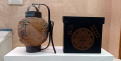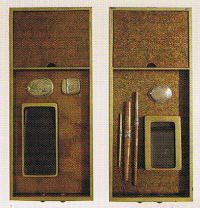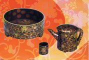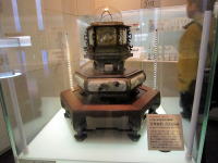 左の懸硯の上の引き出しには文具類が入っていました。↑の写真は左が水滴左が香炉どちらも薩摩の竪野焼のもの。この他、やはり竪野焼きや銀製の文鎮なども展示されていました。 |