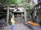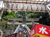 | 品川神社は階段の上。大祭中、お神楽が奉納され、参道には色々な露店が並びます。 |