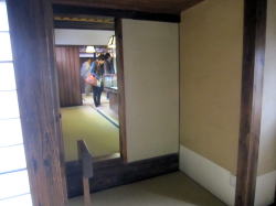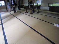 大村益次郎、長与專斎、福沢諭吉ら、のべ人数3000人と言われる塾生たちが起居していた大部屋。一人一畳分を割り当てられて生活していたとのこと。毎月の試験の成績により場所の割り当てが決まったそうです。 |