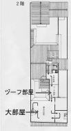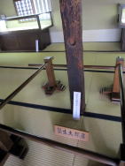 | 左は2階の見取り図です。大部屋の真ん中にある柱にはいくつも刀傷が残っています。思うように勉学が進まずストレスがたまった塾生が切りつけた(?) |