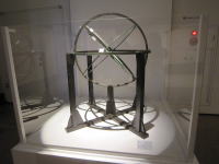 これは渋川春海が使っていたという 渾天儀(こんてんぎ)。渾天儀は天体の位置測定に用いる道具。輪っかは水平線、子午線、赤道 を表す。右は実物です。 |