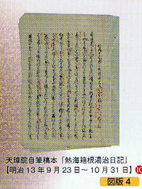 | 自筆の筆稿本「熱海箱根湯治日記」。この旅の目的の一つは和宮終焉の地を訪れることでした。 |