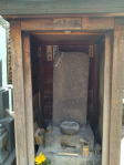 木戸の先、長屋と長屋の間の四角い空き地には共同の井戸。洗濯物や端切れ、洗い張りの板までありました。横に入ると共同便所です |