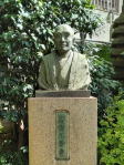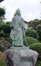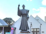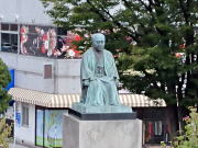 深谷駅2Fブリッジから見える駅前広場の渋沢栄一の銅像は膝に書物を広げています。論語? |