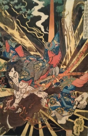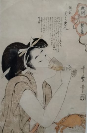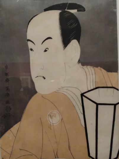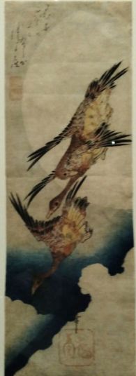 各浮世絵師につき一枚ずつ、撮影可の浮世絵がありました。左から歌麿「教訓親の目鑑 俗ニ云 ばくれん」、写楽「三世坂東彦三郎の鷺坂左内」、北斎「富嶽三十六景五百羅漢寺さざゐどう」、歌麿「月に雁」、国芳「小子部栖軽豊浦里捕雷(こしべのすがるとよらのさとにらいをとらう)」 |