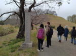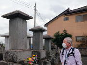 下手計(しもてばか)で下車し、まず尾高家の墓地へ。左手前が惇忠の墓。ガイドは獏塾塾長のバクさん |
