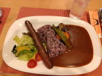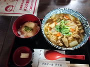 栄一が生涯好物だった煮ぼうとう。鶏肉、大根、人参、油揚、葱、椎茸、白菜入り醤油味のほうとうです。とろろご飯と山芋の漬物付 |
