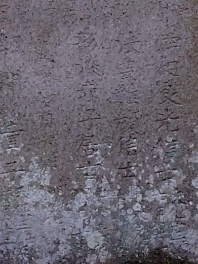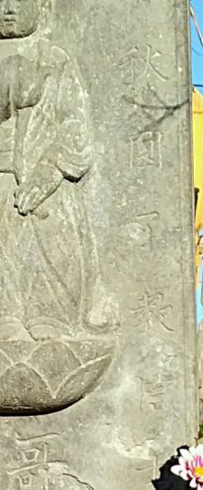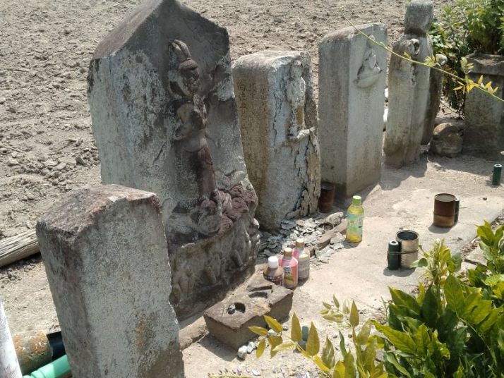 法光寺付近の地図に「三野宮の道標」と書かれていた石像群。左の像は六臂で足下に三猿がわかりますが他は崩れていて不明でした |
