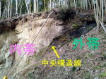 この近くでは中央構造線が露頭しています。右の図外帯(緑)と内帯(ピンク)の明瞭な境界が確認できます |