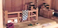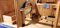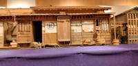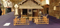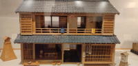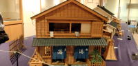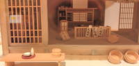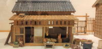 | 熊さん八つぁんの住む長屋。あちこちに模型を移動するうち破れた障子は却って長屋の雰囲気。雨樋や雨戸、へっつい等も忠実に作られています |