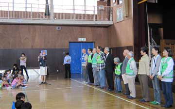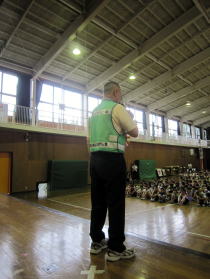 | スクールガードのつるまきさんが、大人の代表でお話を。→ |