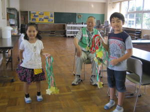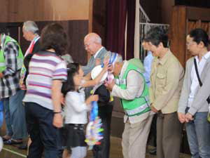| 二年生の子供たちが感謝の手作りペンダントをかけてくれました。真中はスクールガードリーダーのつるまきさん。 |