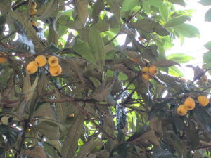 裏庭の琵琶がたわわになっています。雀や椋鳥もいましたが、カラスが大きな実をもぎ取って飛んでいきました。 |