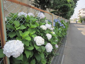 アジサイの季節でもあります。フェンス際は白、ピンク、紫、青のアジサイでいっぱい |
