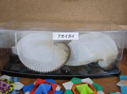 これは貴重なアオイガイ。薄くてきれいで壊れやすいのです。実はタコの仲間だそうです。 |