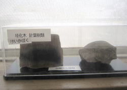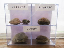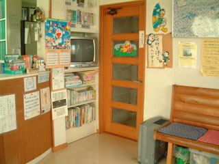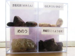 | 化石の研究をしていらっしゃる知り合いから頂いたものを待合室に陳列しました。子供が喜びそうな恐竜のポスターや本、それに化石類です。木の化石、石炭の化石、それに今砂浜で見つかる貝類の祖先の化石。 |