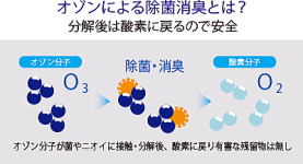 オゾン発生装置は人体に無害な濃度に調整され、また、人が50cm以内に近づくと自動停止します。 |