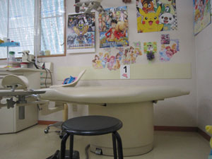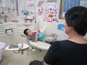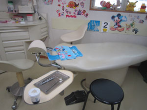 黒い椅子にはママに座ってもらい、治療の様子を見てもらいます。お母さんにも歯科の勉強をしてもらいます。 |