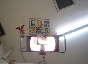 | ユニットには鏡がついています。治療の様子が見えます。これから何をするか説明しながら治療を進めます。退屈しのぎのポスター付 |