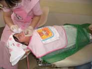 | 4歳のお子さん | 通常はこの年齢になると、例えば麻酔の痺れ感とか、多少の薬のにおい、大きな音などに対して容認できるようになります。でも、上に書いたように、「泣かないこと」を強制したり約束したりしないことにしています。「自分はもう大きいからいい子にしなければいけない」と思ってカチカチになっているお子さんに「泣いてもいいんだよ」といってあげることでずいぶん気が楽になるはず。最初に泣いてしまうとあとはさっぱりするらしく、途中まで、アシスタントのお姉さんが足を押さえたりすることが必要な場合もありますが、最後には大体落ち着いて治療を受け入れることが出来ます。 |