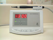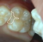 先端を歯のみぞにあてると、ウィンドウに数値が表示されます。全然虫歯が無い部分では数値はゼロ、中の方まで(象牙質まで)虫歯が進んでいると80〜99といった高い数値が表示されます。30前後の数値までなら歯を削らず、せいぜいシーラント、その間の数値なら溝の中をよく清掃してみます。 |
