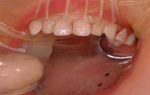 レジンはセメントでつけるのではなく、歯にじかに詰めます。あらかじめ歯に表面処理を施し、深さ30ミクロンほどの細かい凹凸をつくり、そこに流れのよいレジンを流し込むことによって歯に接着させます。むし歯部分が残っているとレジンは接着しません。また、この凹凸部分が唾液に触れると平らになってしまい、レジンが接着しません。従って、むし歯部分を確実に除去することと、唾液に触れないようにすることが必須です。だからラバーダムと麻酔(神経の生きている歯であれば)が必要になるのです。 |