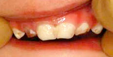 お口を見てびっくり!上の前歯が全部、ひどい虫歯になっています。