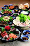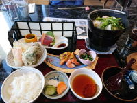 「旬の膳」:鴨団子鍋、鮭けんちん焼、牡蛎のシソ揚げ、刺身、ご飯、香の物 |