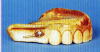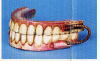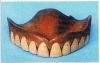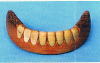 | 日本の木製義歯(左)は歯肉に吸着し、奥歯部分は鋲が打ってあり、咬めるものです。 西洋の義歯(右上下)は動物の骨で作られ、バネで開くので咬むことは出来ず、吸水性のため悪臭を放ちます |