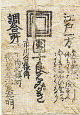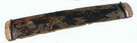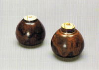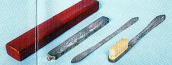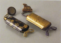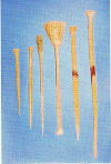 日本の歯ブラシは「房楊枝」で、房状の楊柳の棒の先で磨きます。女性用はお歯黒を傷つけないように房が長く柔らかい。右は歯磨き粉。浮石末に色や香りを付けたものも。 |