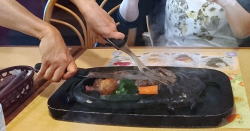 ラグビーボールみたいな形のハンバーグを店員さんが目の前で半分に切り、鉄板に「じゅー」と押し付けるスタイル |