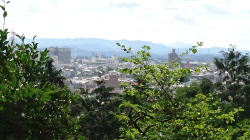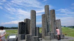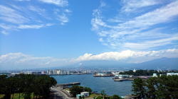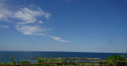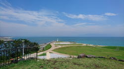 | 右上写真の展望山の上からの駿河湾。伊豆半島がうっすら見えました。とてもきれいな海の色でした。 |