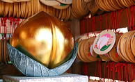 これは病魔払いの「なで桃」。イザナギ命が悪鬼に追われた時桃を投げて追い払ったという古事記の話に由来します。 |