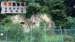 百穴の並びに「「巌窟ホテル」の看板!?明治の終りに、21年かけてノミひとつで、こつこつ岩を掘ってホテルを作り上げた人がいたそうで。その後崩落があって今は廃墟。心霊スポットになっているそうです。 |