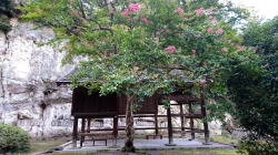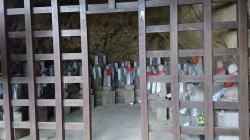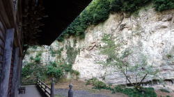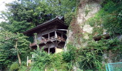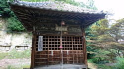 松山城址の麓。岩を穿って観音像を祀ってある「岩室観音」のお堂。9世紀ごろ建てられ、松山城主が代々信仰しましたが戦火で焼失し、これは江戸時代にたてられたものです。 |