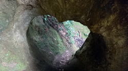| お堂の後ろ側の崖を鎖をたよって登ると、こんなハート形の「胎内くぐり」をすることができます。ここを通るといいことがありますよ。 |
