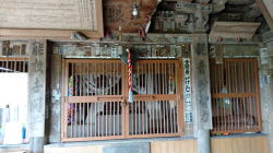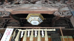 天保6年に建てられた本殿は、県の指定文化財です。本殿の蟇股や縁の下持ち送りの彫刻は格子塀の間から見てもとても立派です。 |