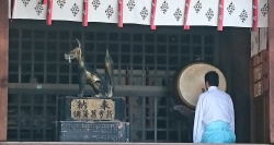 稲荷神社ですから、ご祭神は 宇迦之御魂神(うがのみたまのかみ)。作物蔵の鍵を加えたお狐様の横でお祓いの太鼓をならす宮司さん |