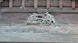 これは本殿蟇股(かえるまた)彫刻「王子喬と唐子」。王子喬は魏晋時代の仙人。真中の板の地紋は「蜀江錦繋文様」その下は「入子菱文様」 |