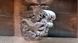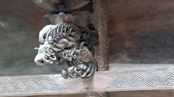 縁の下持ち送り彫刻「山椒魚」水辺に生息するサンショウウオは、火の災いを うけないよう、願いをこめて彫られたと思われます。 |