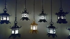 記念撮影コーナー には様々な美しい灯篭。普段は参拝不可の内殿が設置してあり、ここに提げられた「瑠璃灯篭」はとても美しい青でした。 |