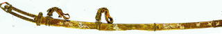 金地螺鈿毛抜形太刀。柄や鍔などは金無垢に線彫りの文様。鞘の部分の雀を追う猫の装飾は見事な螺鈿細工です。 |