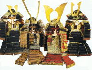 上の左の二つ(黒革威伊予札胴丸と赤糸威大鎧・梅鶯飾:素敵でした)は展示中でした。右の二つはこれからの展示です。この四領の甲冑はいずれも国宝です。 |