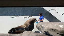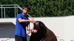 トドの給餌を見学。繁殖期には少し体重が減るので彼は今500kgほど(!) |