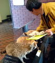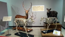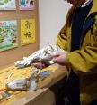 現在のテーマは「皮と骨」。コンセプトは「触って学ぼう」。↑はイタチや狸のの剥製を撫でたり、猪の顎の骨で、学生時代の解剖学を復習する哲雄先生。企画展示室には毛皮や骨格標本がいっぱい。 |