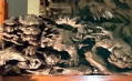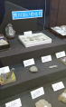 化石館ですから化石だらけ。左は秩父荒川沿いの化石、真中は山梨産の、スカシカシパンヒトデの化石、右はアメリカ産古代サメの歯の化石です。恐竜の骨格標本もありました。 |