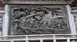 | 佐原八坂神社の大祭の翌日、1時間前に山車が戻ってきていた山車会館に 入館。山車側面の彫刻は、日光東照宮を手掛けた職人が彫ったもの。 |