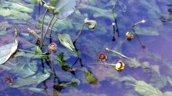 小野川の流れの中、黄色い花をつけているのは千葉県選定の保護生物「ナガバコウホネ」 というスイレン科の植物です。水がきれいで、水中で十分光合成ができないと育ちません。 |