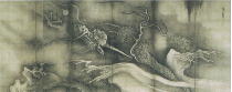 上は「山水図」。従来の山水図と異なり、人物が中心に置かれている。下は「龍虎図」。六曲一双の大きな屏風の右双。左双は虎が描かれます。 |
