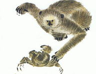 中国の絵の模写であるとされる絵でも、雪村の独特の工夫が見られます。これは背後に沢山の猿が蟹を狙っている絵の一部です。 |